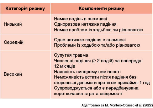 вгоруЗгідно із рекомендаціями M. Montero-Odasso etal. (2022), для осіб старшого віку, які проживають у громаді, за стандартного підходу до оцінювання ризику падінь використовуються три категорії: низький, середній (проміжний) і високий (табл. 1).