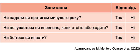 Як зазначалося вище, базове оцінювання літньої людини для визначення факторів ризику падінь має починатися із запитання «Чи падали ви за останні 12 місяців?». Однак слід зауважити, що це запитання є специфічним для прогнозування майбутніх падінь, але характеризується низькою чутливістю і високим рівнем помилково негативних результатів. Своєю чергою опитувальник «Три ключові запитання» (3KQ) демонструє вищу чутливість (табл. 2).
