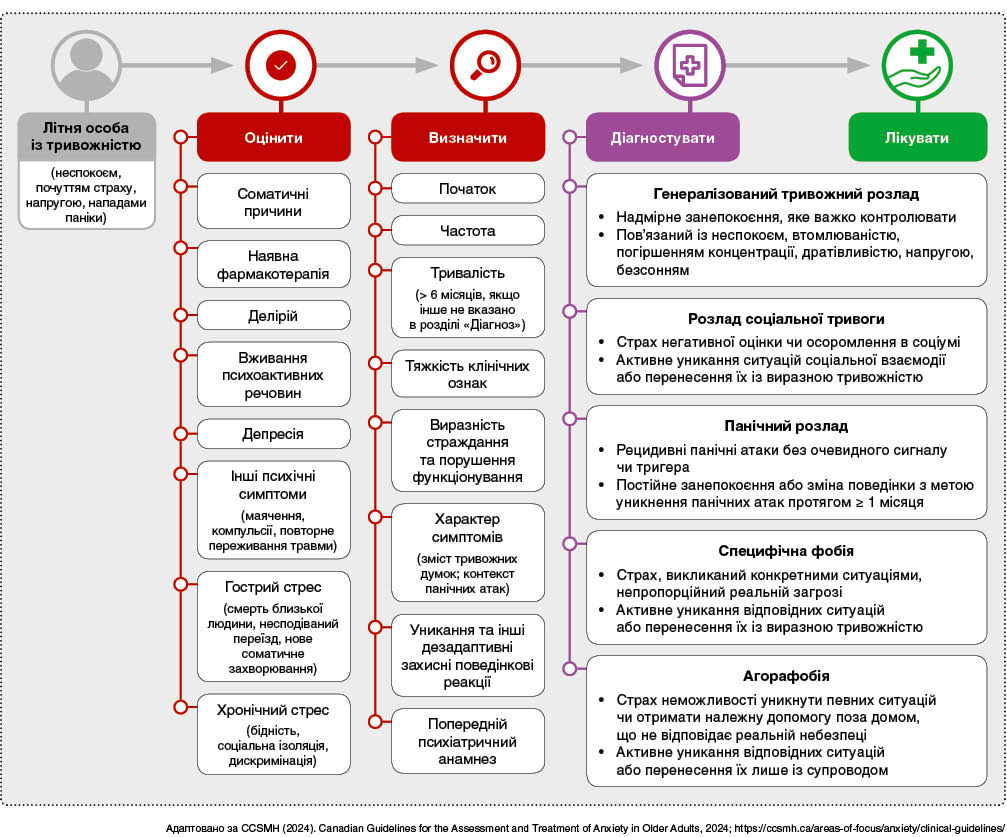 Нині тривожні розлади є одними з найпоширеніших порушень психічного здоров’я в осіб літнього віку. Коморбідність із депресією та соматичними захворюваннями, порушеннями когнітивних функцій, стигматизація, ейджизм часто ускладнюють діагностування й призначення адекватного лікування. До вашої уваги представлено загальний огляд настанови з профілактики, діагностики та лікування пацієнтів літнього віку з тривожними розладами, яку розробили фахівці Канадської асоціації з питань психічного здоров’я осіб похилого віку (CCSMH, 2024) за підтримки Агентства громадського здоров’я Канади (Public Health Agency of Canada) для поліпшення психічного здоров’я цієї популяції.