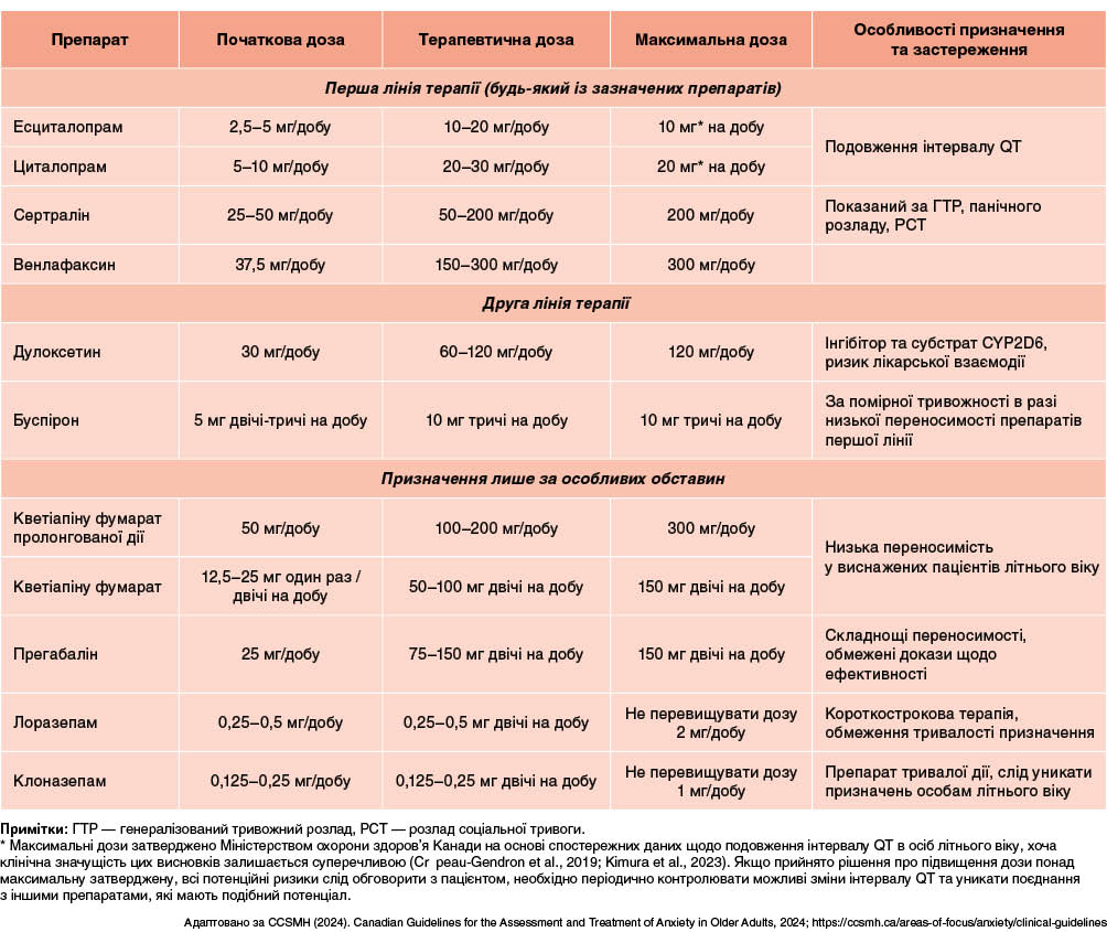 вгоруУ таблиці 3 наведено дані щодо медикаментозного лікування, ефективність якого підтверджена даними рандомізованих контрольованих плацебо досліджень у літніх осіб (віком > 60 років) із тривожними розладами або клінічно значущим станом тривожності. Щодо інших препаратів, які часто використовують на практиці (міртазапін, тразодон або канабіноїди, зокрема канабідіол), нині бракує достатніх доказів для призначення їх пацієнтам цієї вікової категорії (CCSMH, 2019d).