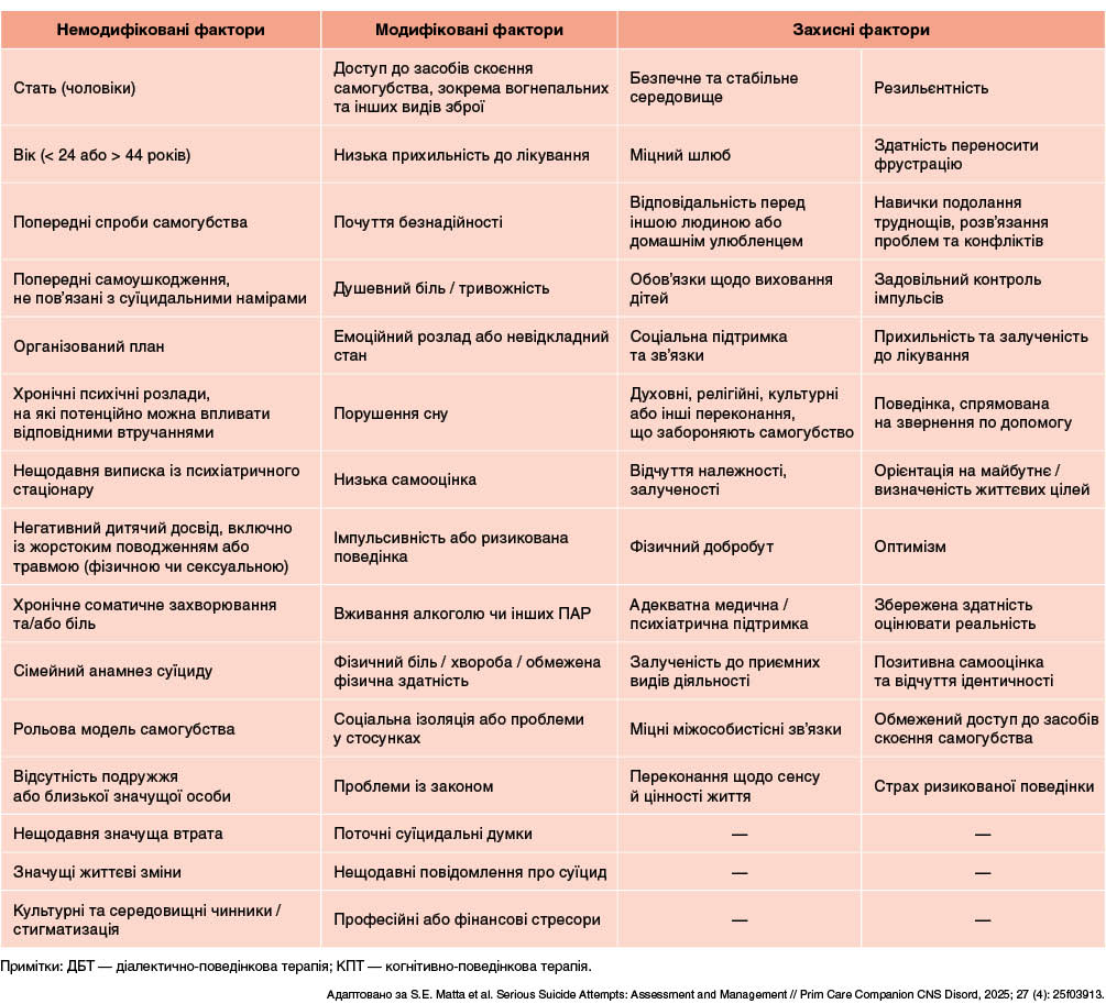 Чинники ризику поділяють на гострі або хронічні, а також немодифіковані (чоловіча стать, вік, попередні спроби, сімейний анамнез) та модифіковані (табл. 1), серед яких ключовими є доступ до засобів скоєння самогубства, симптоми нелікованих психічних захворювань, почуття безнадійності, порушення сну, вживання ПАР та соціальна ізоляція (Koh etal., 2025). Наявність модифікованих факторів визначає неминучий ризик суїциду і потребує запобіжних заходів. Для інтеграції засобів оцінювання та лікувальної тактики доцільно запроваджувати стратифікований підхід до профілактики: ризики високого пріоритету (наприклад, недавні наміри чи доступ до засобів скоєння самогубства) потребують негайного втручання, натомість середні та низькі ризики — індивідуалізованої підтримки і тривалого спостереження (табл. 2).