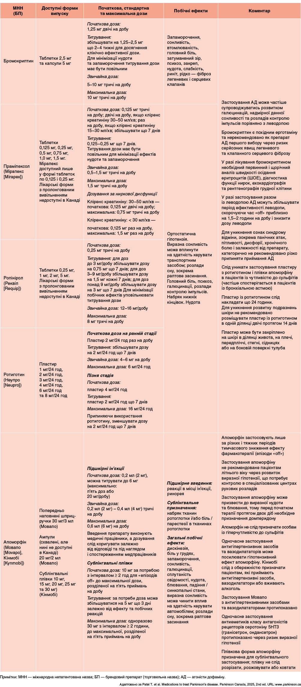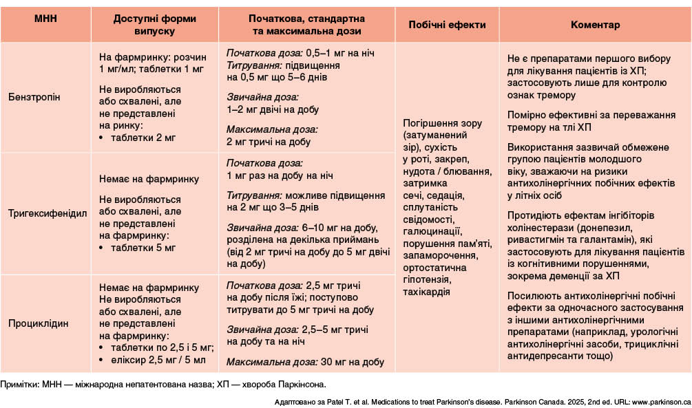 Кожну із зазначених груп можливо застосовувати як засіб монотерапії на ранніх стадіях захворювання, однак вибір препарату залежить від віку пацієнта, клінічної картини, тяжкості перебігу, а також попередньої ефективності фармакотерапії та особливостей побічних ефектів раніше призначених ліків. Хоча антихолінергічні засоби (як-от бензтропін, тригексифенідил) можуть призначати для контролю ознак тремору, їхня ефективність обмежена і їх не розглядають як препарати першого вибору. У літніх пацієнтів використання цих препаратів пов’язане з високим ризиком порушень пам’яті та сплутаної свідомості (табл. 1). Тому призначення цих ліків зазвичай обмежене лише категорією пацієнтів молодшого віку (Grimes etal., 2012; Grimes etal., 2019).