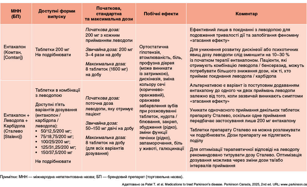 Інгібітори катехол-О-метилтрансферази (КОМТ) уповільнюють розщеплення леводопи в периферичних тканинах або запобігають йому, що дає змогу більшій кількості основного препарату потрапляти до головного мозку та перетворюватися на дофамін (Standaert etal., 2017).