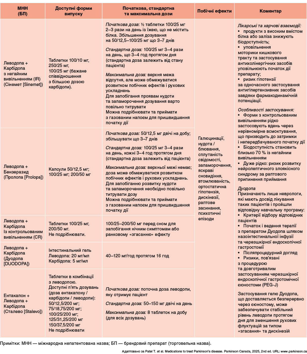 Хвороба Паркінсона — це прогресуюче нейродегенеративне захворювання, що вражає нервову систему людини та найчастіше має ознаки порушення рухових функцій. Лікування є комплексним і спрямоване на полегшення стану та поліпшення якості життя пацієнта з хворобою Паркінсона До вашої уваги представлено короткий огляд оновленої публікації T. Patel et al. (2025) «Medications to treat Parkinson’s disease», у якій її автори приділили особливу увагу питанням фармакодинаміки лікарських засобів, що використовують у терапії пацієнтів із хворобою Паркінсона, рекомендаціям щодо їхнього дозування, опису найпоширеніших побічних ефектів і потенціалу ймовірних взаємодій з іншими медикаментами або продуктами харчування.
