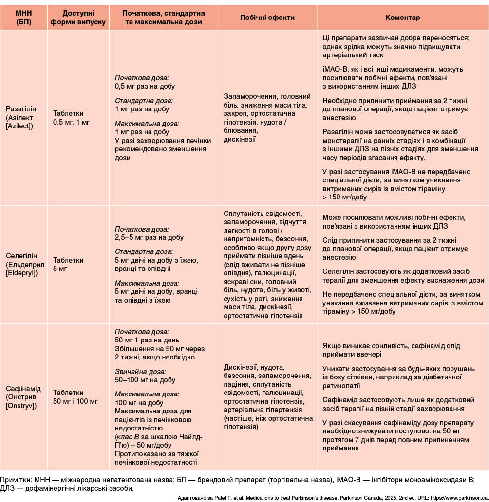 Агоністи дофаміну (АД) є синтетичними агоністами дофамінових рецепторів, які імітують дію дофаміну в головному мозку людини (Standaert etal., 2017). Інгібітори моноаміноксидази типу-В (MAO-B) запобігають розщепленню дофаміну до головного мозку через блокування дії ферменту МАО-В, внаслідок чого підвищується концентрація дофаміну, доступного для використання нервовими клітинами (Olanow etal., 2009). Механізм дії амантадину за лікування пацієнтів із ХП остаточно не з’ясовано. Однак, зважаючи на антагонізм щодо NMDA-рецепторів, застосування препарату зменшує ознаки дискінезії (Standaert etal., 2017).