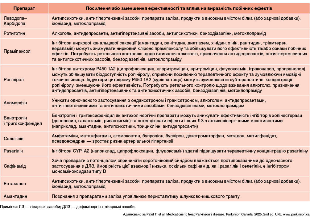 вгоруМіжлікарські взаємодії (відомі як взаємодії лікарських засобів) — це зміни в ефективності одного з медикаментів, спричинені одночасним прийманням іншого препарату, що може призвести до посилення або послаблення відповідного клінічного впливу, розвитку токсичності або утворення нових, непередбачених властивостей. Одночасне застосування дофамінергічних ліків підвищує ймовірність виникнення дофамінергічних побічних ефектів. Тому рекомендовано уникати препаратів, одночасне використання яких може погіршити перебіг ХП. У разі потреби призначення антипсихотиків препаратами вибору вважаються кветіапін і клозапін. Застосування в пацієнтів із ХП антигіпертензивних ліків і препаратів із гіпотензивним ефектом (наприклад, трициклічні антидепресанти) сприяє фармакодинамічному синергізму з можливим наслідком ортостатичної гіпотензії. Використання цих засобів слід контролювати особливо уважно за одночасного приймання з дофамінергічними препаратами. Крім того, слід ретельно відстежувати небажані реакції надмірної седації, запаморочення та постуральної нестійкості з ризиком падінь за одночасного застосування засобів, які посилюють седативний ефект (антихолінергічні препарати, антидепресанти, бензодіазепіни тощо). Також слід детально вивчити перелік лікарських засобів, які на поточний момент приймає пацієнт із ХП, щоб оцінити ймовірність їх потенційної взаємодії (табл. 7).