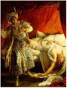 вгоруВенеційський мавр Отелло, головний герой трагедії 1604р. англійського драматурга й поета Вільяма Шекспіра, одружується зі своєю коханою, донькою сенатора Дездемоною. Однак заздрісники з їхнього оточення розробляють підступний план, аби посварити щасливе подружжя. Після низки підлаштованих «доказів» Отелло починає підозрювати дружину в зраді та поводитися з нею чим далі грубіше. Кульмінацією твору стає сцена в спальні, коли, незважаючи на присягання Дездемони у вірності, мавр душить її, а потім ще й заколює. Після з’ясування правди він у відчаї теж учиняє суїцид.