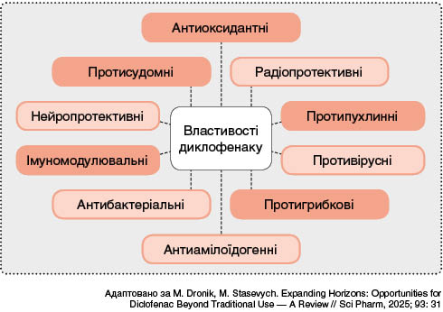 На особливу увагу заслуговує перепозиціонування генеричних засобів із добре вивченим первинним механізмом дії та профілем безпеки, які широко застосовуються у клінічній практиці протягом тривалого часу. Одним із них є нестероїдний протизапальний препарат (НПЗП) диклофенак, широко застосовуваний для лікування больових синдромів і запалення різного генезу, особливо при ревматичних захворюваннях, артриті, післяопераційному болю та травмах (Dronik, Stasevych, 2025). «Класичний» механізм дії диклофенаку добре вивчений — він полягає у неселективному пригніченні ферментів циклооксигенази (ЦОГ)-1 та ЦОГ-2. Завдяки цьому знижується синтез простагландинів, ключових медіаторів запалення, болю та лихоманки. Побічні ефекти диклофенаку, як і інших НПЗП, головним чином зумовлені пригніченням ЦОГ-1, що впливає на гомеостатичні функції простагландинів (Gan, 2010). Проте ефективність диклофенаку для зменшення болю та запалення є незаперечною.
