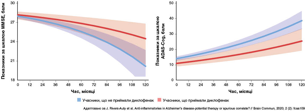 Основні результати клінічних досліджень нейропротективної дії диклофенаку наведено в таблиці. Ретроспективний аналіз даних ефективності НПЗП із застосуванням узагальненої лінійної моделі зі змішаними ефектами продемонстрував, що диклофенак виявився єдиним НПЗП, який був пов’язаний зі значущим зменшенням когнітивного зниження за короткою шкалою оцінювання психічного статусу (MMSE). Цей ефект наближався до значущості для показників за шкалою оцінювання когнітивних функцій за ХА (ADAS-Cog) із клінічно значущими розмірами ефекту (рис. 2). Вплив диклофенаку на зниження показників за MMSE залишався значущим (p = 0,039) після корекції на множинні порівняння (Rivers-Auty etal., 2020).