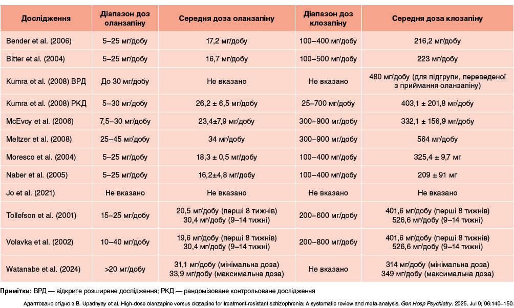 У систематичному огляді B. Upadhyay etal. наведено діапазони дозувань оланзапіну, які варіювали від 5 до 45 мг/добу, а середні дози зазвичай становили 16–34 мг/добу (таблиця). Крім того, у декількох спостереженнях, зосереджених на популяції пацієнтів із резистентністю до лікування, було зафіксовано призначення вищих доз (до 30–45 мг/добу). Дозування клозапіну варіювало в межах від 25 до 900 мг/добу, причому переважно застосовували середні дози 200–565 мг/добу. H. Y. Meltzer etal. (2008) повідомили про найвищу середню дозу клозапіну (564 мг/добу) для пацієнтів із резистентністю до лікування.
