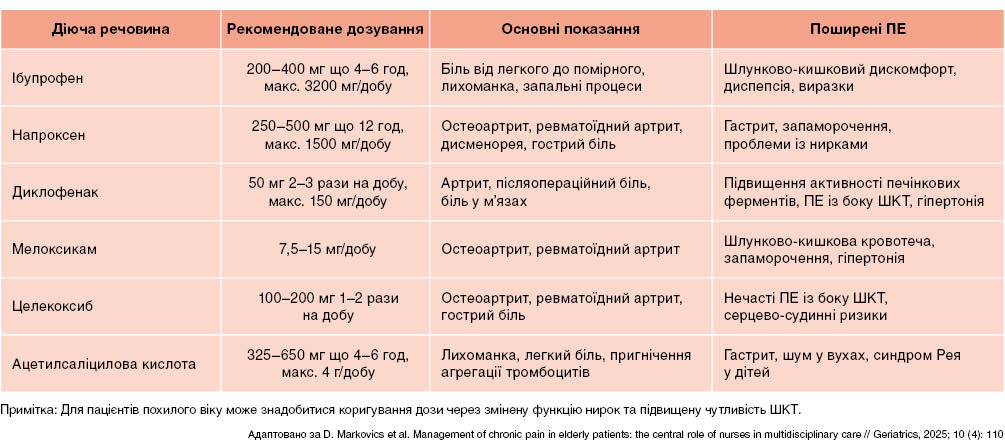 НПЗП із помірним/сильним знеболювальним і протизапальним ефектом, як-от ібупрофен, диклофенак та напроксен, можуть спричиняти подразнення шлунково-кишкового тракту (ШКТ), кровотечі, порушення функції нирок, а також підвищують ризик серцево-судинних захворювань. Метамізол чинить сильний знеболювальний та жарознижувальний ефект, йому притаманна менша кількість ПЕ із боку ШКТ, але він зрідка спричиняє агранулоцитоз. Парацетамол має легку або помірну знеболювальну і жарознижувальну дію, пов’язаний із мінімальним ризиком ПЕ з боку ШКТ або серцево-судинної системи, але у високих дозах може призводити до гепатотоксичності (LaForge etal., 2023) (табл. 1).