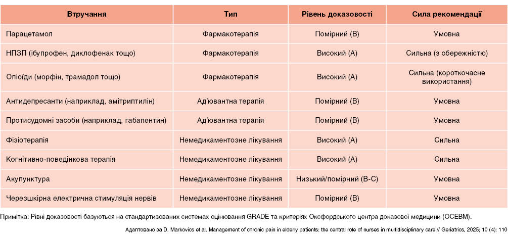 D. Markovics etal. (2025) наголошують на необхідності адаптації підходів, основаних на рекомендаціях, до специфічних реалій лікування геріатричних пацієнтів, розробці персоналізованих контекстно-чутливих стратегій та міждисциплінарній співпраці при веденні осіб похилого віку із ХБ. На основі даних систематичних оглядів, метааналізів та настанов ВООЗ, Американського геріатричного товариства (AGS), Національного інституту охорони здоров’я та клінічної досконалості Великої Британії (NICE) та кокранівськіх оглядів автори узагальнили рекомендації щодо лікування осіб похилого віку із ХБ, оцінивши їх з погляду ефективності, безпеки та актуальності (табл. 2).