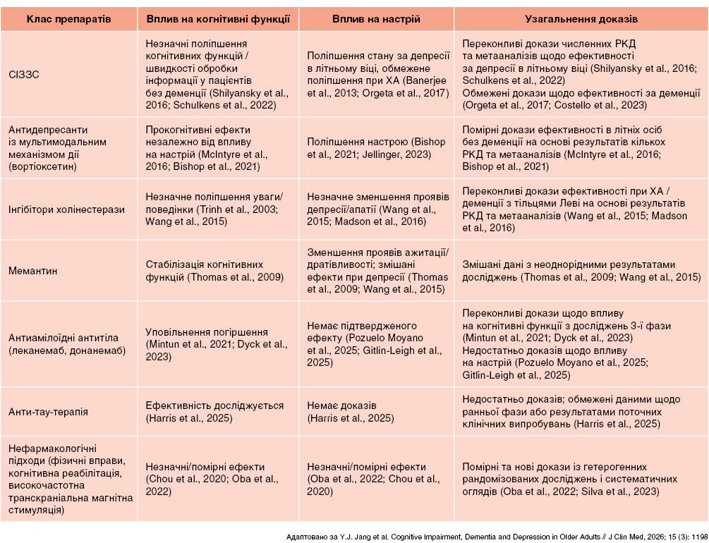 Взаємовплив терапевтичних підходів, спрямованих на настрій та КФ, зумовлює як можливості, так і обмеження. АД незначно поліпшують ВФ і ШОІ у літніх осіб без деменції, але за наявної деменції їх ефективність суттєво знижується. У пацієнтів із деменцією ІХЕ, мемантин та нефармакологічні втручання передусім зменшують прояви апатії та нейропсихіатричні симптоми, із менш послідовним впливом на симптоми депресії. Нові хворобомодифікувалні методи можуть змінити траєкторію розвитку ХА, але не підтверджено їхній прямий антидепресивний ефект. Y. J. Jang etal. (2026) наголошують на необхідності персоналізованих, стадіоспецифічних стратегій ведення пацієнтів, із тривалим моніторингом КФ, оцінюванням судинного та нейропсихіатричного ризику, мультимодальними втручаннями, адаптованими до їхніх клінічних профілів. За стійкого порушення ВФ, погіршення пам’яті, високого показника ГБР або швидкого порушення функціонування виправдане застосування нейровізуалізації або дослідження біомаркерів. Взаємодія настрою та КФ у пізньому віці чинить прямий вплив на функціонування, зокрема мобільність, стабільність ходи, ризик падінь і незалежність у повсякденній активності.
